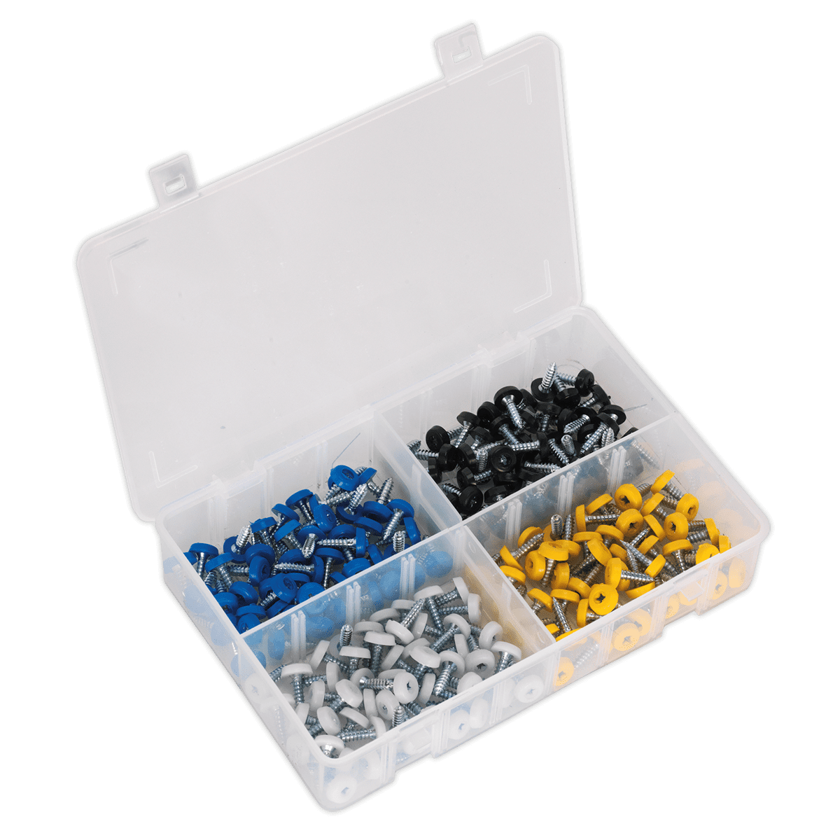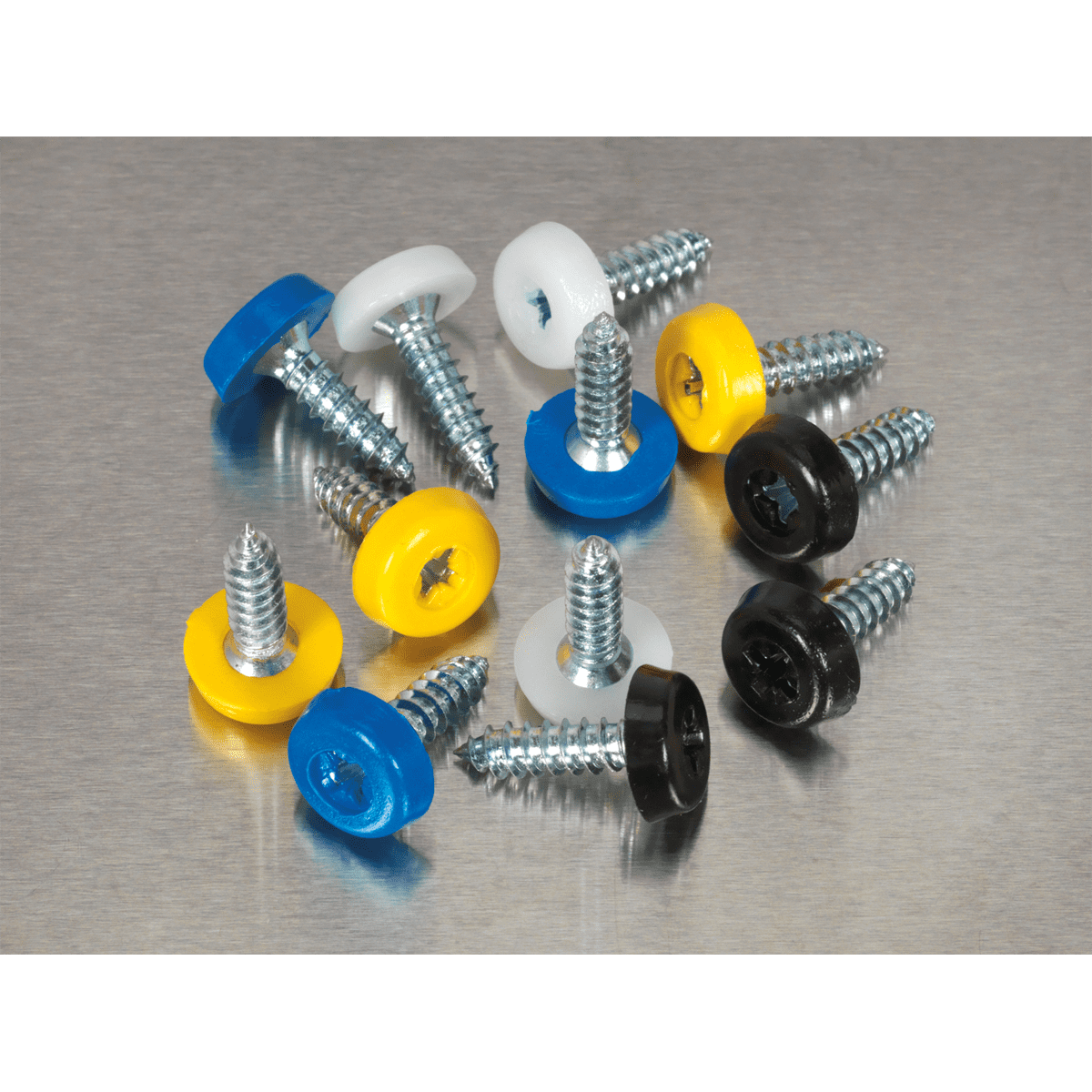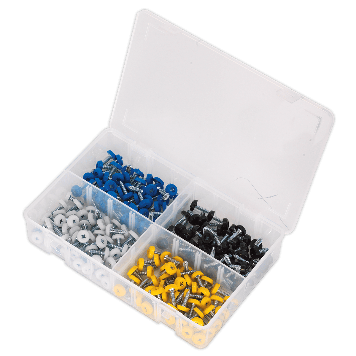 Number plate screws. • Plastic enclosed head. • Quantity: 200. • Colours: Black, Blue, Yellow & White. • Supplied in partitioned box.